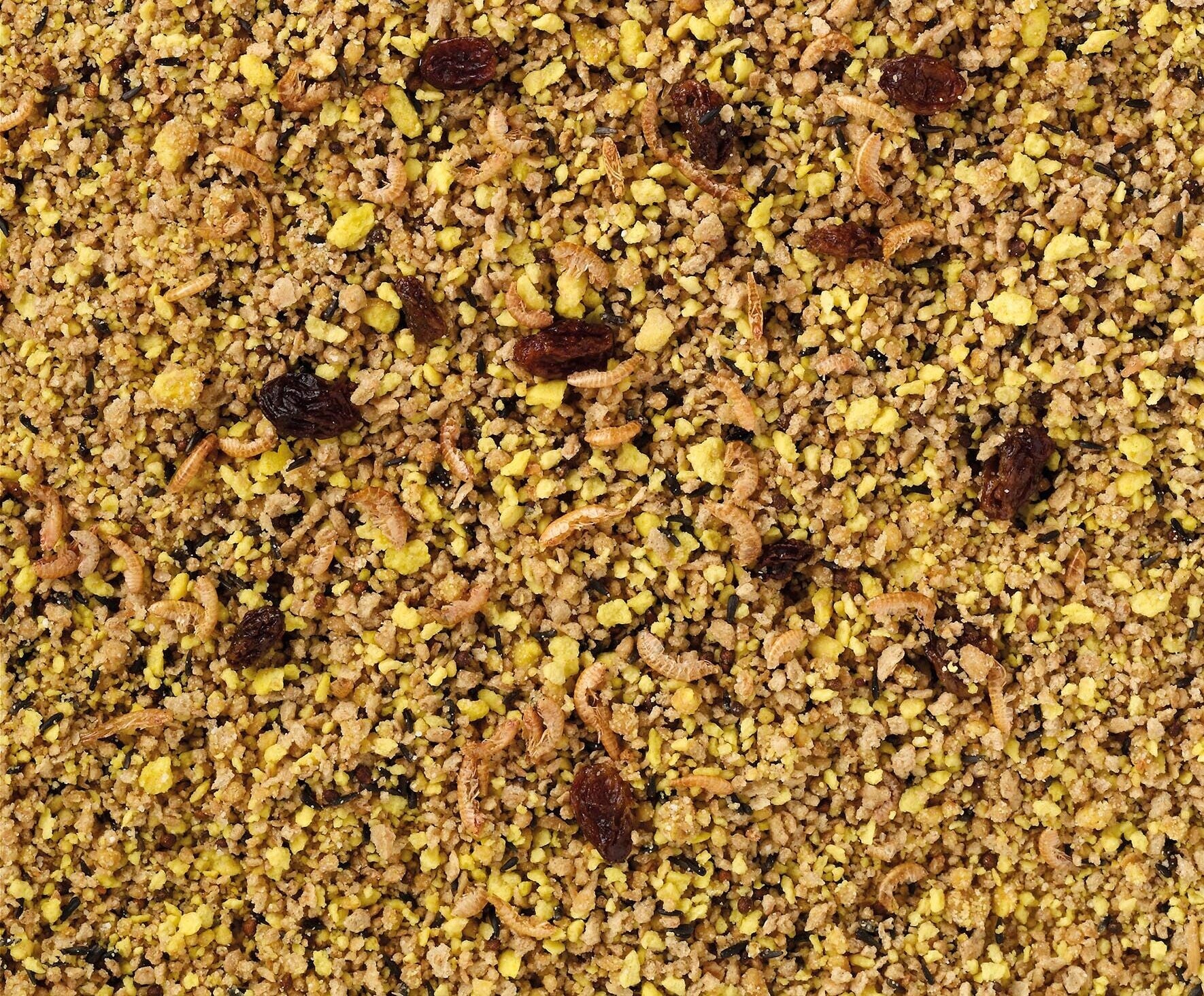 - La pâtée est enrichie de crevettes et de gammares séchés, raisins, baies de sorbier et un mix de légumes.