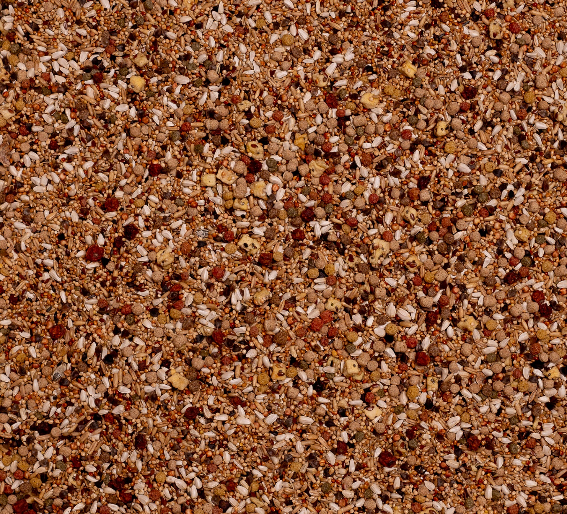 Céréales, graines (1 % de chia, 1 % de quinoa), minéraux (2,5 % de grit pour oiseaux), fruits (1 % de pommes séchées, 1 % de sorbier séché, 0,25 % de figues séchées), sous-produits d’origine végétale, légumes, levure, huiles et graisses