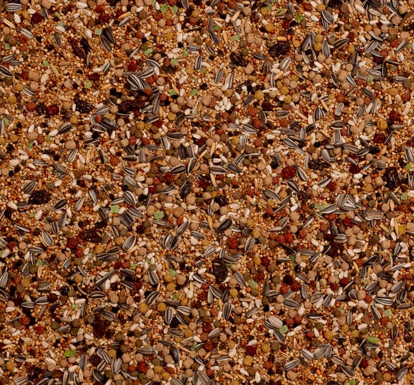 Céréales, graines (1 % de chia, 1 % de quinoa), fruits (1 % de papaye séchée, 1 % de pomme séchée, 1 % de kiwi séché), minéraux (2,5 % de grit pour oiseau), sous-produits d’origine végétale, légumes, levure, huiles et graisses