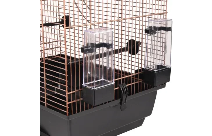 - 3 perchoirs en synthétique et 2 gamelles d’alimentation/d’abreuvement amovibles