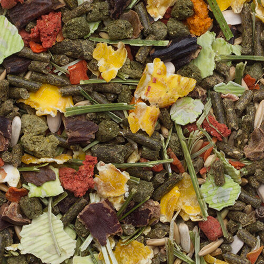 Sous-produits d’origine végétale, céréales, légumes 10% (dont 60% de flocons de pois, 15% lupins, 20% de carottes et 5% de flocons de poireau), fruits 5,0% (dont 100% de caroubes), graines, minéraux, huiles et graisses